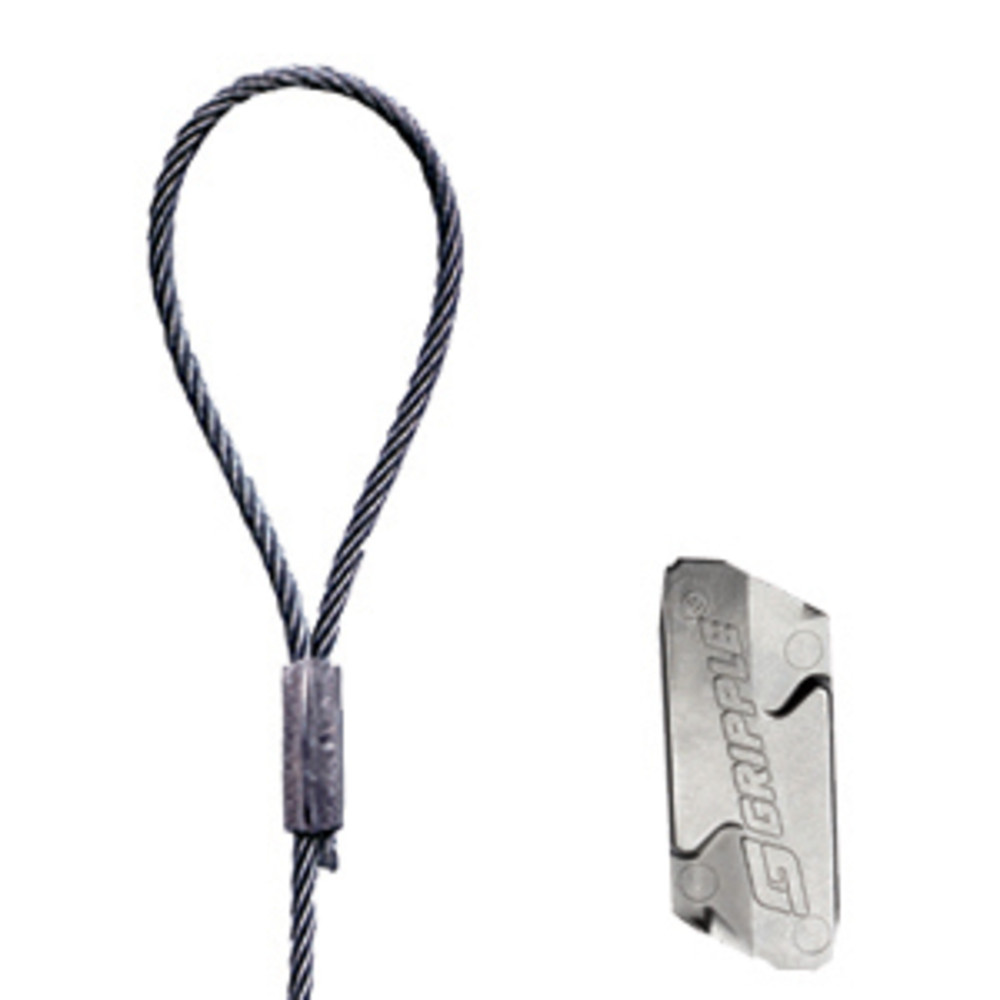 Gripple Aufhängesystem Edelstahl: Schnell, vielseitig einsetzbar und gebrauchsfertig. Besteht aus einem 1M-langen Drahtseil mit Schlaufe (FR) und einem selbstblockierenden und verstellbaren Drahtseilhalter Nr. 2.