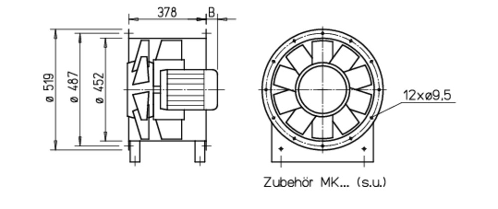 Axial-Mitteldruckventilator. Rohrgehäuse aus Stahlblech mit beidseitig angeformtem Flansch, Lochbild nach DIN 24155 Blatt 3, eingebautes Nachleitrad aus Stahlblech. Oberflächenschutz durch Pulverbeschichtung RAL 7015 (grau). Axiales Laufrad, zehn aerodynamisch profilierte Schaufeln aus Aluminiumguss. Vibrationsfreier Lauf durch dynamische Wuchtung nach Gütestufe G 6.3 VDI 2060 und DIN ISO 1940. Schaufeln im Stillstand stufenlos verstellbar. Wartungsfreier Drehstrom -IEC-Normmotor, Schutzart IP55, mit serienmäßigem Klemmenkasten aus Kunststoff, außen am Rohr montiert.