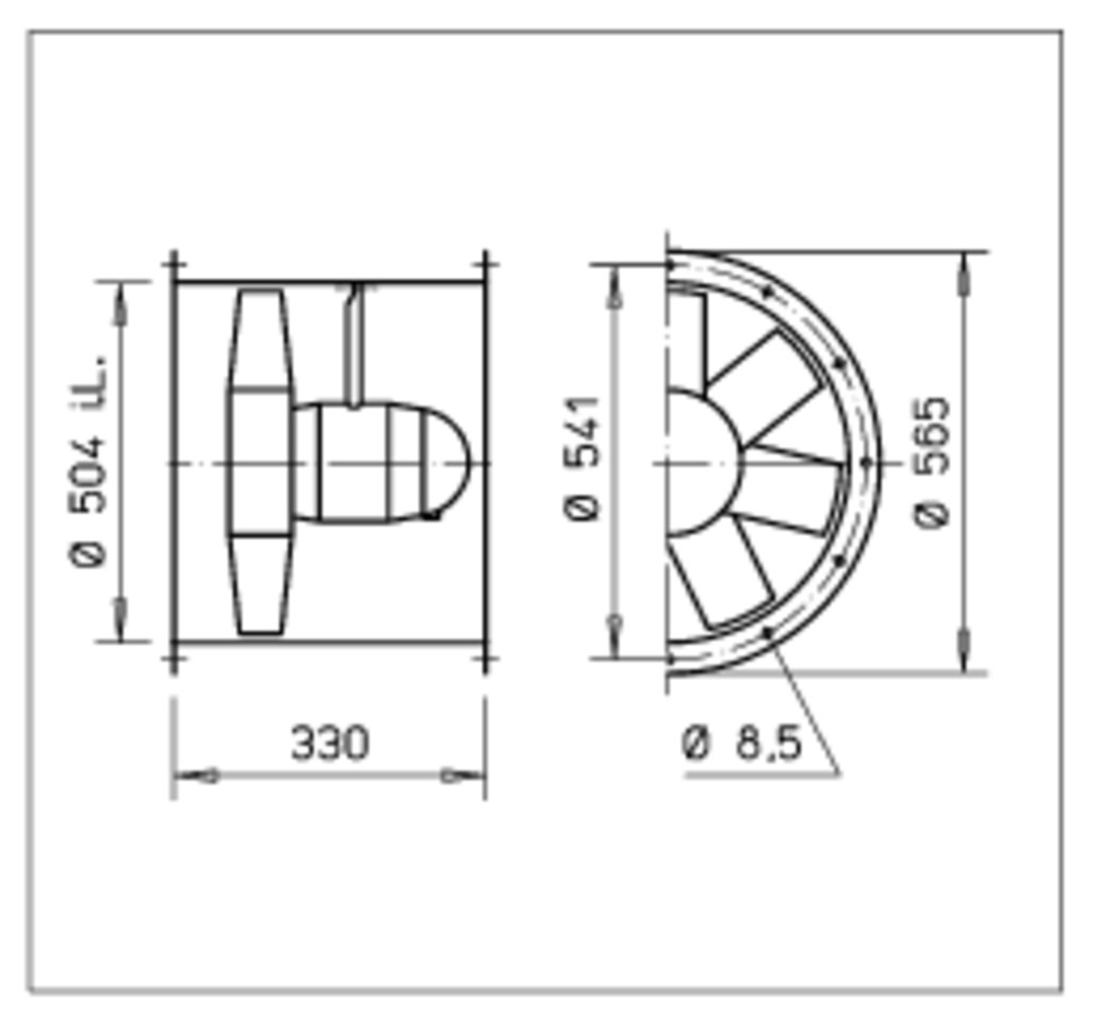 Axial-Hochleistungsventilator Rohrhülse zylindrisch, beidseitige Flansche, direkt angetrieben.Zylindrisches Rohr aus verzinktem Stahlblech, mit Laufrad umschließend, beidseitig angeformtem Flansch, Lochbild nach DIN 24155. Mit außenliegendem Klemmenkasten.Laufrad mit profilierten Schaufeln aus Kunststoff. Hoher Wirkungsgrad, niedriges Betriebs- geräusch. Vibrationsfreier Lauf durch dynamische Wuchtung nach Gütestufe G 6.3 VDI 2060 und DIN ISO 1940. Einsetzbar im Bereich von -30 °C bis +60 °C.Einphasen-Wechselstrom-Kondensator-Motor, geschlossene Bauweise, wartungsfrei, mit in die Wicklung eingebauten Thermokontakten, drehzahlsteuerbar durch Spannungsredu- zierung, gedichtete, geräuscharme Kugellager mit Langzeitschmierung.
