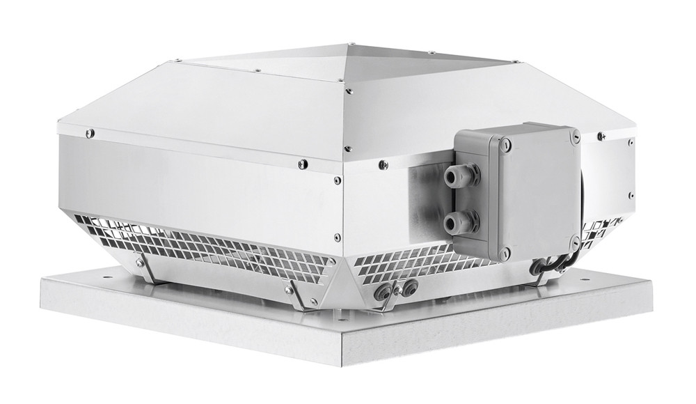 Horizontal ausblasender Dachventilator mit wirkungsgradoptimiertem Aluminiumgehäuse und neu entwickeltem Hochleistungs-Radiallaufrad. Gehäuse aus seewasserbeständigem Aluminium mit integriertem Eingriffsschutz. Motortragplatte und Grundplatte mit Einströmdüse aus verzinktem Stahl. Grundplatte mit Gewindeschrauben zum Befestigen von saugseitigem Zubehör (Lochbild nach DIN 24155, Bl. 3). Schutzgitter serienmäßig an der Ausblasseite entsprechend DIN EN ISO 13857. Hochleistungs-Radial-Laufrad mit rückwärts gekrümmten Schaufeln aus verzinktem Stahlblech. Dynamisch gewuchtet nach DIN ISO 1940-1. Drehzahlsteuerbarer Einphasen-Wechselstrom-Außenläufermotor in geschlossener Bauart in IP44. Kugelgelagert mit Feuchteschutzisolation. Wartungs- und funkstörungsfrei.