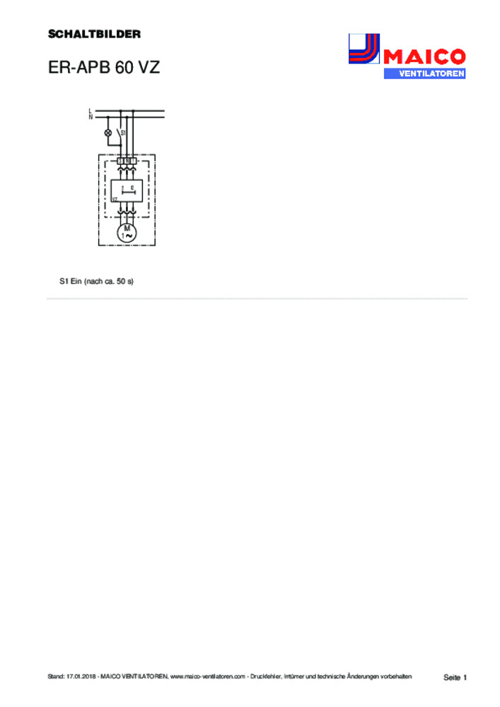 Ausführung mit Verzögerungszeitschalter: Einschaltverzögerung ca. 50 sek. Nachlaufzeit ca. 6 min. Nicht drehzahlsteuerbar. Aufputzventilator mit G2-Filter zur Entlüftung von Bädern, WCs oder Wohnungsküchen. Mit wartungsfreier Brandschutz-Metall-Absperrklappe gegen Brandübertragung K90-18017. Gehäuse drehbar, dadurch Anschluss des Ausblasstutzen links oben oder rechts oben an die Hauptleitung. Farbe verkehrsweiß ähnlich RAL 9016. Problemloser Filterwechsel ohne Werkzeug. Metall-Ausblasstutzen DN 75/80 mit Metall-Absperrklappe mit selbsttätiger Auslöseeinrichtung. Die extrem steile Kennlinie zeigt das hohe Druckvermögen der ER-Ventilatoren. Robuster energiesparender Kondensatormotor. Wartungsfrei, mit beidseitig geschlossenen Kugellagern. Elektrische Steckverbindung für schnelle Montage des Ventilators im Gehäuse. Alle MAICO ER-Geräte entsprechen der Schutzart IP X5 und können somit im Bereich 1 nach DIN VDE 0100-701, auch bei Strahlwasser, eingebaut werden. Details siehe Planungshinweise. Schutzklasse II. Allgemeine bauaufsichtliche Zulassung, Zulassungs-Nr.: Z-51.1-45. Zulassungsbescheide auf Anfrage oder auf unserer Homepage www.maico-ventilatoren.com. Volumenstrom-Kennlinie und Leckluftrate geprüft vom TÜV Bayern e.V. Leckluftvolumenstrom < 0,01 m3/h. Schachtpegeldifferenz gemäß DIN 4109, geprüft vom IAB Oberursel. Mit VDE-Zeichen.Artikel: ER-APB 60 VZ, Ausführung: Verzögerungszeitschalter, Fördervolumen: 61 m3/h, Drehzahl: 1250 1/min, Luftrichtung: Entlüftung, Drehzahlsteuerbar: nein, SEC average: -3,62 kWh/(m2*a), Bemessungsspannung: 230 V, Netzfrequenz: 50 Hz, Leistungsaufnahme: 21 W, IMax: 0,17 A, Schutzart: IP X5, Netzzuleitung: 5 / 1,5 mm2, Einbauort: Wand / Decke, Einbauart: Aufputz, Systemart: dezentral, Material: Kunststoff, Farbe: verkehrsweiß, ähnlich RAL 9016, Gewicht: 2,1 kg, Filterklasse: G2, Brandschutz: ja, Absperrvorrichtung: integrierte Metall-Absperrklappe mit Auslöseeinrichtung, Anschlussdurchmesser: 75 mm / 80 mm, Breite: 236 mm, Höhe: 236 mm, Tiefe: 217,5 mm, Fördermitteltemperatur bei IMax: 40 °C, Nachlaufzeit: 6 min, Einschaltverzögerung: 50 s, Schalldruckpegel: 43 dB(A) / Angabe gemäß DIN 18017-3 bei einer äqivalenten Absorptionsfläche AL = 10 m2, Zulassungsnummer: Z-51.1-45, Nennweite: 75 mm / 80 mm