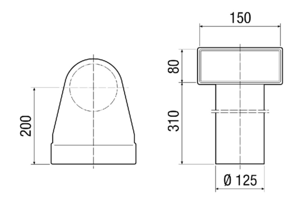 90°-Übergangsstück vom runden Querschnitt (Zu- oder Abluftventil) auf Einschubadapter MF-WE. Anschlussstutzen mit Muffenmaß.Artikel: MF-WL125 80/150, Luftrichtung: Be- und Entlüftung, Einbauort: Decke / Fußboden / Wand, Material: Stahlblech, verzinkt, Gewicht: 1 kg, Nennweite: 125 mm, Breite: 262,5 mm, Höhe: 390 mm, Tiefe: 150 mm, A: 80 mm, B: 150 mm