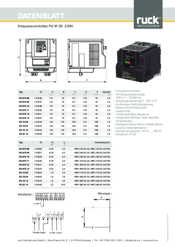 Ruck Frequenzumrichter FU 15 09mit werksseitiger Parametrierung für MPS/MPC/DVN/DVNI 450 D4 IP 20 für Schaltschrankeinbau Versorgungsspannung 230 V 1~ 50/60 Hz Ausgangsspannung 0 - 230 V 3~ Stufenlose Drehzahlregelung Motor-/Umrichterschutz Integrierter Funkensto?rfilter/Klasse A Integrierte Modbus- bzw. BacNet-Schnittstelle Konfigurierbares Status-/Fehler-Relais Leichte Inbetriebnahme Temperaturbereich -10 °C ... +40 °C