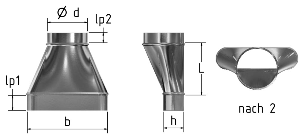 m+a Übergang UARO rund-oval, asymm., oben gerade, BxH=320x80mm, auf Durchmesser=100mm, L=175mm